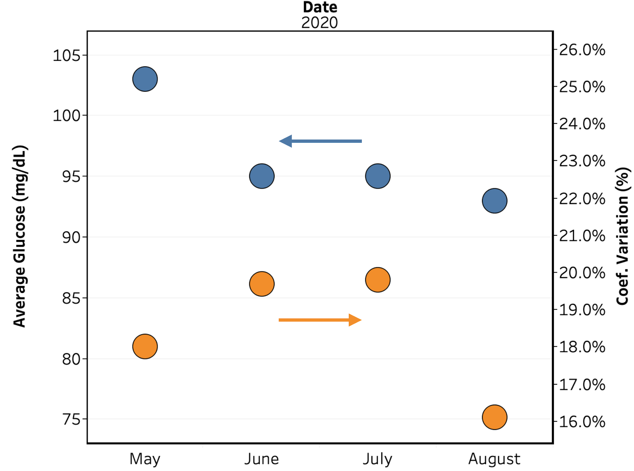 Figure 1.Average blood glucose (blue) & coefficient of variation (orange) by month.